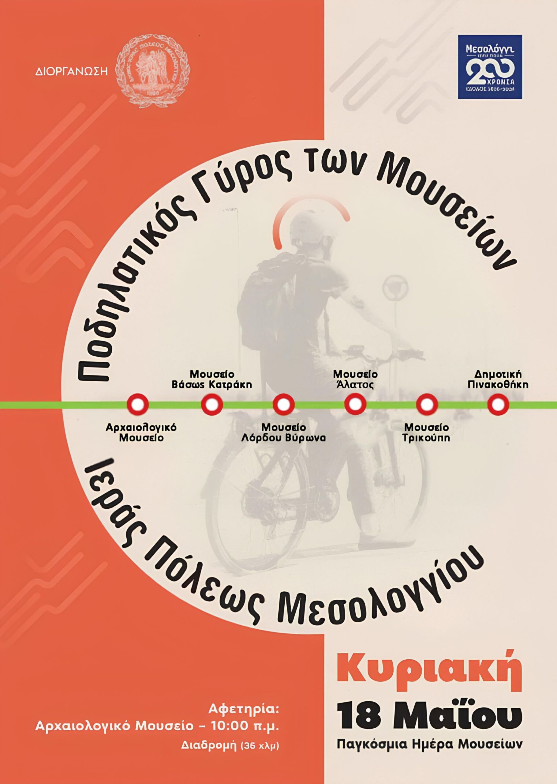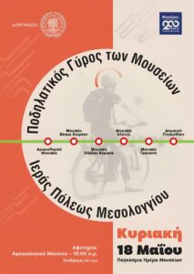 Ο Δήμος Ιεράς Πόλεως Μεσολογγίου διοργανώνει την Κυριακή, 18 Μαΐου 2025, Παγκόσμια Ημέρα των Μουσείων, τον Ποδηλατικό γύρο των Μουσείων Ιεράς Πόλεως Μεσολογγίου, στο πλαίσιο της Επετείου του εορτασμού των Διακοσίων Ετών της Εξόδου του Μεσολογγίου το 2026.