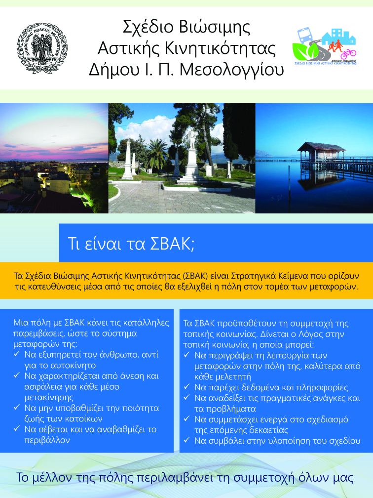 Ο Δήμος Ι.Π. Μεσολογγίου, συμπορευόμενος με τις Εθνικές και Ευρωπαϊκές κατευθύνσεις για την βιώσιμη κινητικότητα, προωθεί την υλοποίηση του τοπικού Σχεδίου Βιώσιμης Αστικής Κινητικότητας (ΣΒΑΚ), το οποίο θα θέσει τις βασικές κατευθύνσεις πάνω στις οποίες θα αναπτυχθεί το σύστημα μετακινήσεων της πόλης τα επόμενα χρόνια.