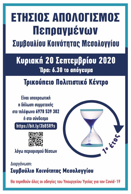 Η Πρόεδρος και τα μέλη του Συμβουλίου Κοινότητας Μεσολογγίου σας καλούν στον ετήσιο απολογισμό των πεπραγμένων του Συμβουλίου Κοινότητας Μεσολογγίου.